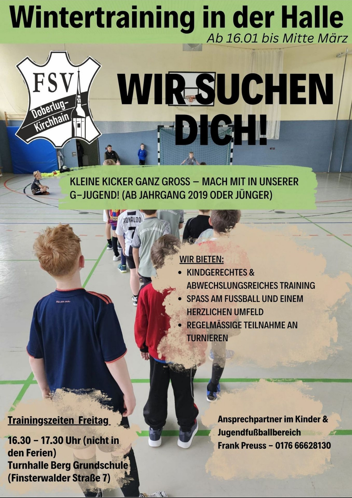 Bambini (Jg. 2017 und jünger): Freitag 16:30 – 17.30 Uhr Halle Luckauer Straße (Sportplatz Kirchhain)